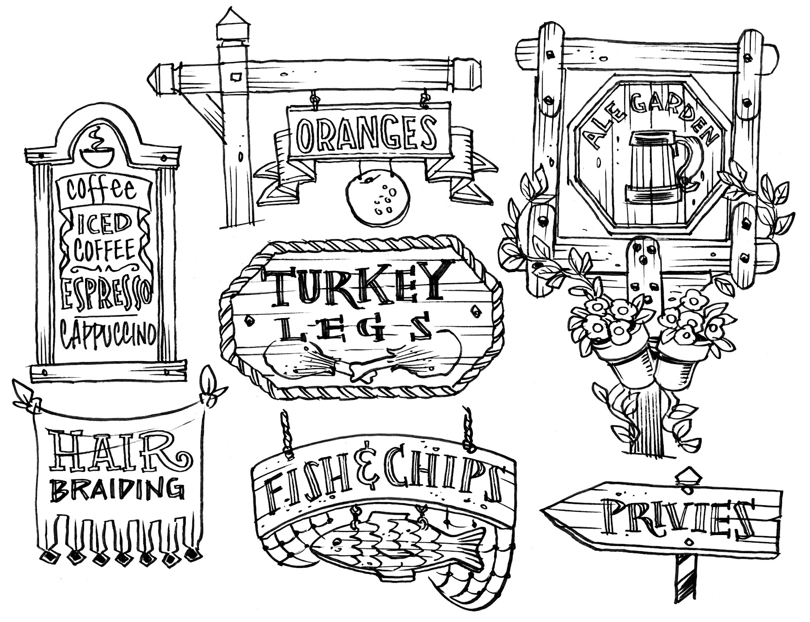 If you think of your Faire layout as a Christmas Tree, your graphic and signage are the ornaments you hang around it each year. While craft booths and stages will fill out the body of your event, the hanging signs and graphics will set the mood and help your guests navigate through your event. Signs, whether painted on canvas or plywood, are a growing investment in the look and feel of your Faire as it grows bigger each year. Signs are easy enough to store during the off-season, and easy to hang and remove before and after the event. The more rustic your signs the better, and the hand painted variety will do much more to transport your guests then anything printed at Kinkos. The 21st century offers us the tempting possibility that we could design our signage in the computer and just blow it up, the drawback is that this frequently is exactly what it will look like. Giant glossy banner do little to transport guests into the 16th century and will ultimately erode the illusion you are trying to achieve with all of your other efforts. It is much better to invest in a few hand-painted, beautiful signs each year and slowly add to your collection, then to cover your event with the equivalent of Budweiser banners.